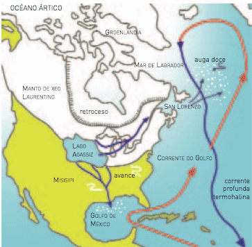 (тёмно-голубые территории - земли, затопленные потопом; светло-голубые - ледник в период максимального распространения).